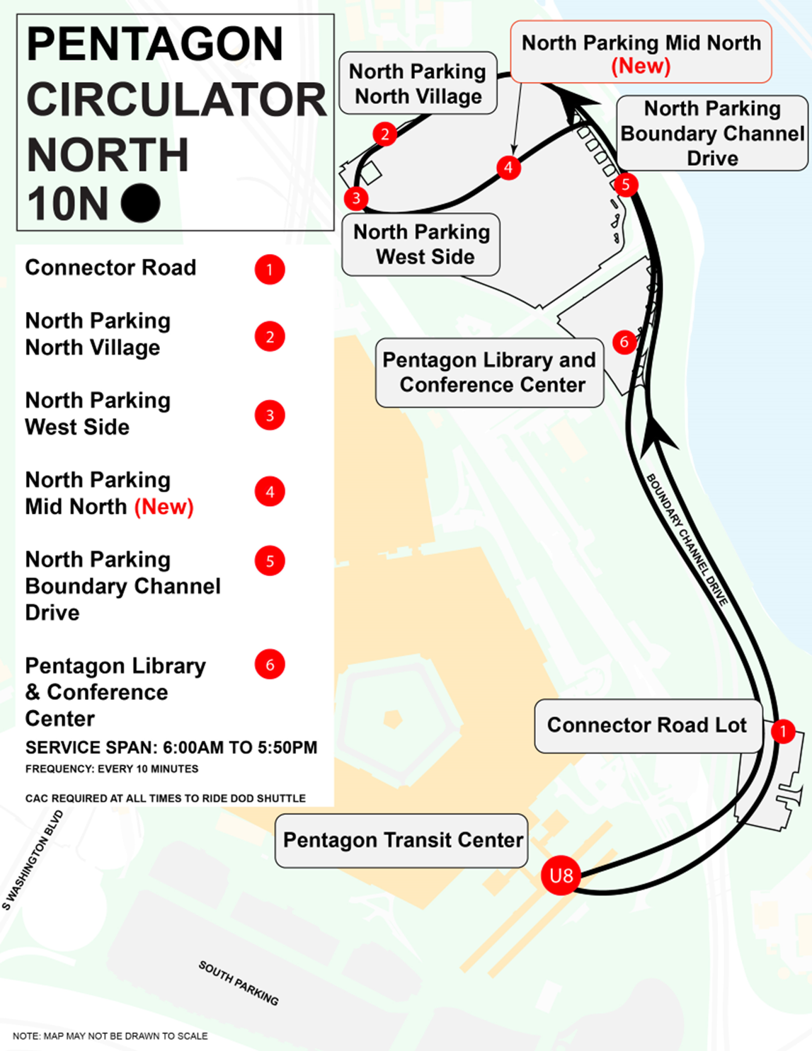 North Parking to/from the Pentagon: For BYCTWD attendees parking in North Parking, special event shuttles are available from Lane 57 to Bus Bays U1/U2 at the PTC. Special event shuttles operate every 10 minutes, from 6:55 a.m. to 10:30 a.m. and from 1:00 p.m. to 3:00 p.m. BYCTWD attendees may also use the employee shuttle - Pentagon Circulator North – 10N when accompanied by DoW personnel with a valid CAC/PFAC. This employee shuttle runs every 10 minutes between 6:00 a.m. and 6:00 p.m., with six stops in North Parking to Bus Bay U8 at the PTC.